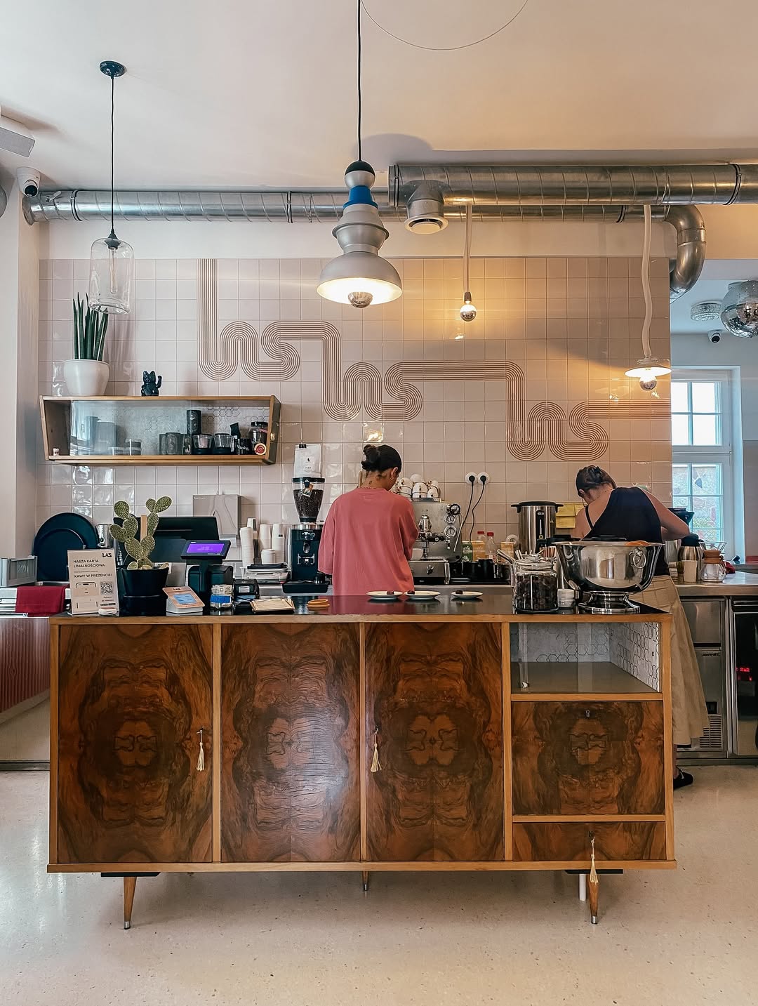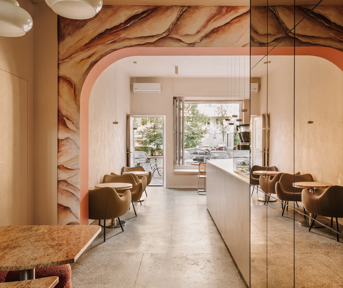 Kaferdam ma surowość, która nie jest chłodna. Wnętrze inspirowane berlińskimi kawiarniami, gra światłem na materiałach i detalami, które tłumaczą koncept marki (woda i refleksy). Jeśli cenisz projekty, w których branding i wnętrze powstają „razem”, a nie osobno, Kaferdam jest świetnym przykładem.