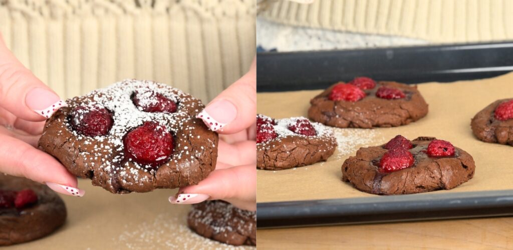 To szybki przepis bez kombinowania. Kilka składników i 10 minut w piekarniku. Ciasteczka wychodzą miękkie w środku z soczystymi malinami, które przyjemnie przełamują czekoladową bazę.