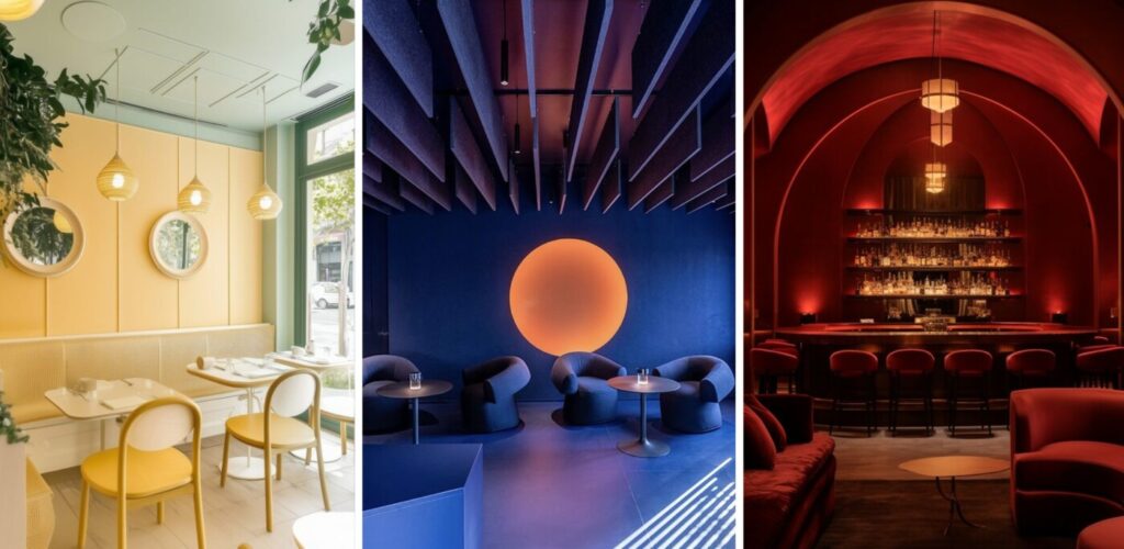 - Ciepłe barwy (czerwień, pomarańcz, złoto) pobudzają głód i energię – idealne do barów, bistro, miejsc z szybkim serwisem.