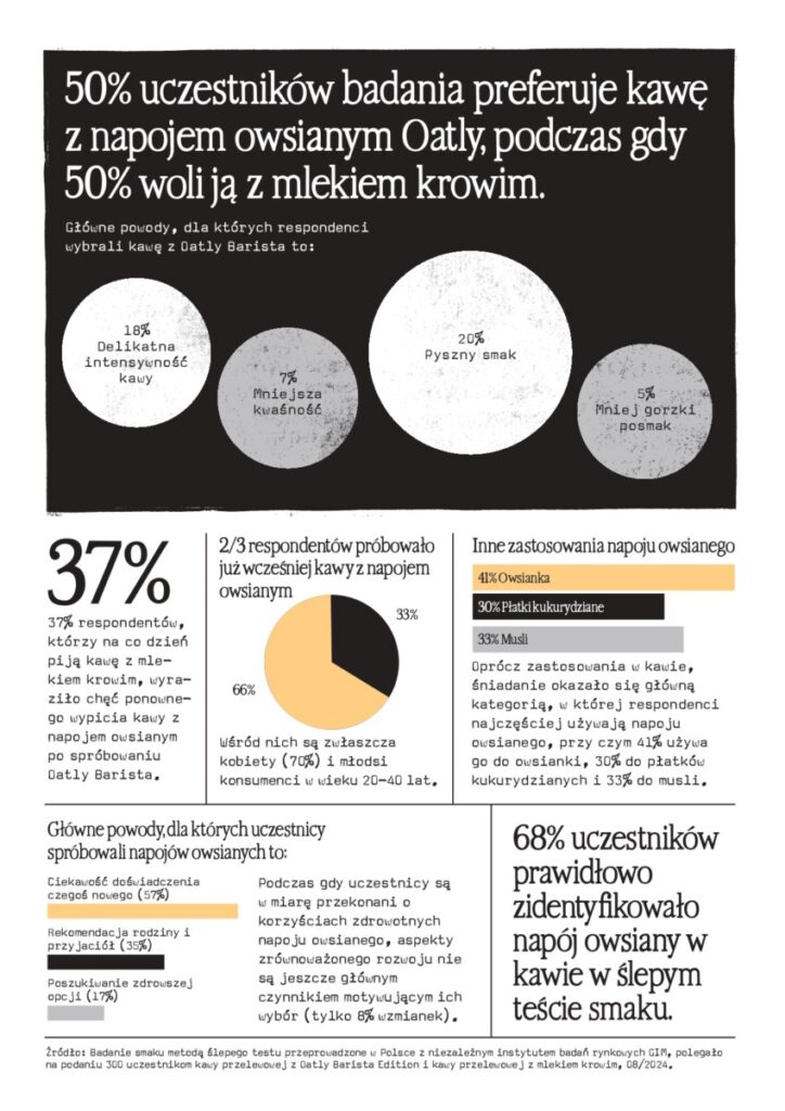 Co ciekawe, według badania, napój owsiany zyskuje popularność nie tylko w kawie, ale także w kontekście posiłków śniadaniowych. Badanie pokazało, że spośród osób, które używają mleka lub jego roślinnych zamienników do śniadania, 33% wybiera napój owsiany do musli, 30% do płatków kukurydzianych i aż 41% do owsianki. Może to wskazywać na szersze zmiany w nawykach żywieniowych w Polsce, które wykraczają poza znany do tej pory obszar zastosowania napojów roślinnych.