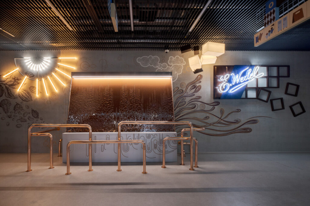 Zacznijmy zatem od samej fasady – przypomina ona gigantyczne kostki czekolady, symbolizujące wieloletnią tradycję Wedla. Budynek, w którym dawniej przechowywano i przetwarzano kakao, został zrewitalizowany z dbałością o każdy szczegół. Materiały i szare cegły ułożone w dekoracyjne motywy są nawiązaniem do pierwotnej fabryki oraz warszawskiego Kamionka.