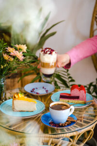 Jeżeli nie robimy sesji stylizowanej na naszych tłach – warto zamiast nich pokazać na zdjęciu wnętrze lokalu, żeby szybko móc zorientować się, gdzie fotografie zostały zrobione. Nie bójmy się poprosić obsługi lokalu o zaparzenie filiżanki kawy czy nalanie napoju w celu stworzenia tła do zdjęć – to właśnie takie drobne elementy robią klimat całej sesji.