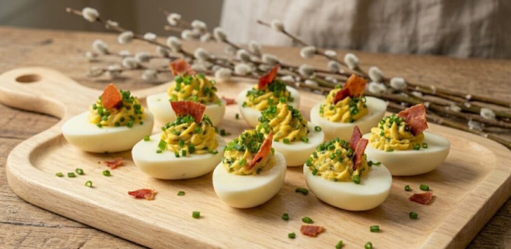 Jajka faszerowane to jedno z tych dań, które regularnie wraca na stół zwłaszcza przy okazji świąt. Tym razem mamy dla Was przepis w trochę bardziej wyrazistej odsłonie, z dodatkiem chrupiącej szynki parmeńskiej i świeżego szczypiorku.