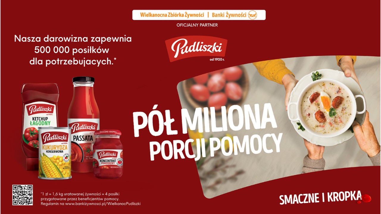 Marka Pudliszki, należąca do Kraft Heinz Polska, w ramach wielkanocnej akcji “Pół miliona porcji pomocy” przekazała równowartość 500 000 posiłków najbardziej potrzebującym. Inicjatywa została zrealizowana we współpracy z Federacją Polskich Banków Żywności, która od lat chroni żywność przed zmarnowaniem i przekazuje ją osobom w trudnej sytuacji życiowej. Pudliszki przekazały 125 tys. zł, a każda złotówka pozwoliła uratować 1,6 kg żywności, z której przygotowano pełnowartościowe dania dla potrzebujących.