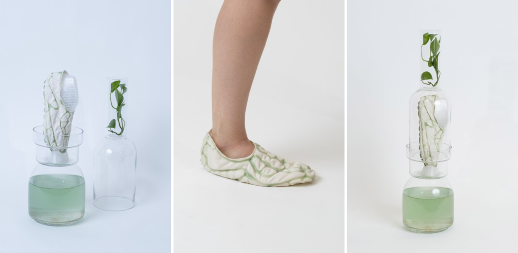 Jessica Thies, projektantka z Brooklynu, opracowała innowacyjną koncepcję butów, które nie tylko wyjątkowo wyglądają, ale także przyczyniają się do ochrony środowiska. Projekt, nazwany Synthiesis, wykorzystuje tusz z żywymi algami, które pochłaniają dwutlenek węgla z atmosfery. Buty są wykonane z tkaniny konopnej, a proces druku tuszem biopochodnym z dodatkiem mikroalg, nadaje im unikalny efekt marszczenia.