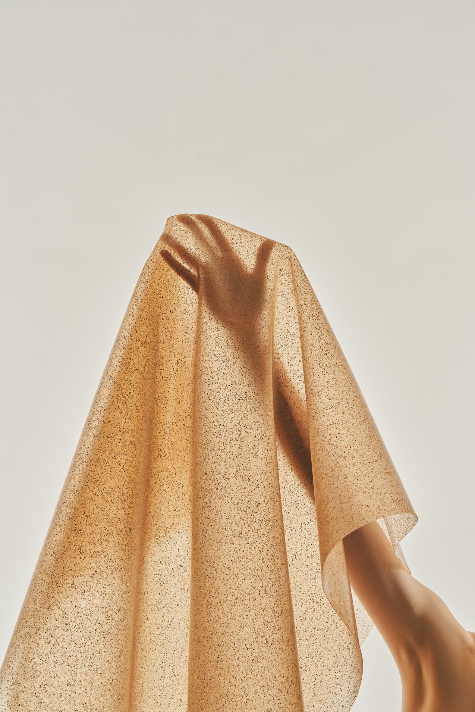 Założyciel studia Shotaro Oshima i jego zespół stworzyli biotekstylię o ziemistym odcieniu, wykorzystując wytłoki jabłkowe odzyskane z japońskiej prefektury Aomori – jednego z wiodących obszarów produkcji jabłek w kraju.