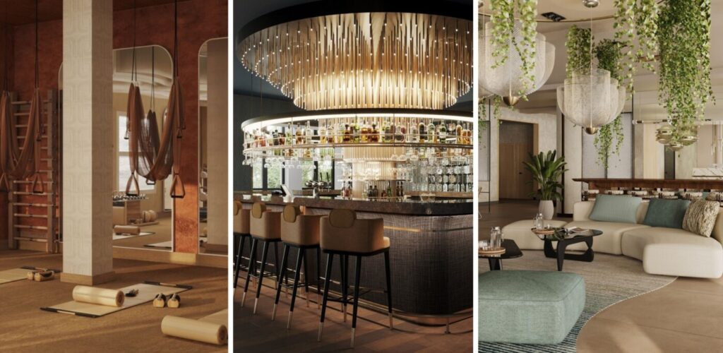 Koncepcja wnętrz Crowne Plaza Paris w Magny-le-Hongre została oparta na trzech motywach stylistycznych: „Ścieżek Parków i Ciszy”, „Cieni Magii” oraz „Za Horyzontem Miasta”. Każdy z nich nadaje wnętrzom inny charakter i atmosferę. „Ścieżki Parków i Ciszy” to przestrzenie zanurzone w naturze – chłodne błękity, zgaszone zielenie i delikatne szarości, które przywołują spokój parkowych alei o poranku. Wyciszają, pozwalają odetchnąć i odzyskać harmonię. „Cienie Magii” to z kolei elegancja wieczoru – głębokie fiolety, atramentowa czerń i butelkowa zieleń. Zestawione z mosiężnymi refleksami, tworzą teatralny nastrój, pełen tajemnicy i wyrafinowania. Natomiast strefa „Za Horyzontem Miasta” wprowadza ciepło i gościnność dzięki naturalnym materiałom, pastelowym beżom, ochrom i fakturom drewna, które otulają poczuciem domowego komfortu. Kluczowym