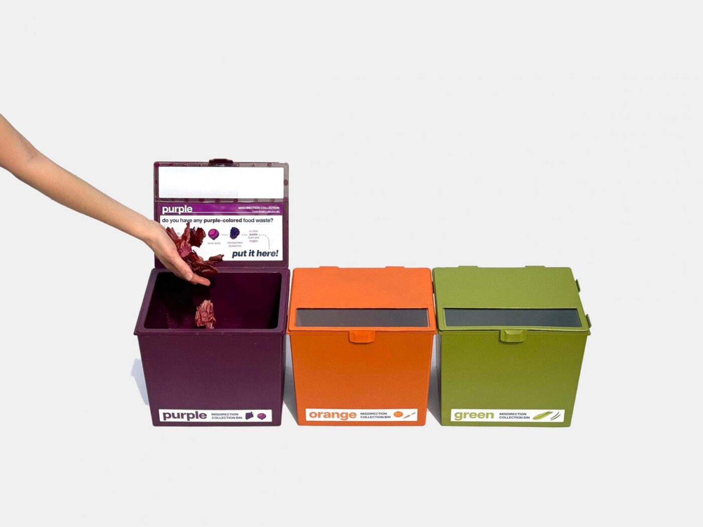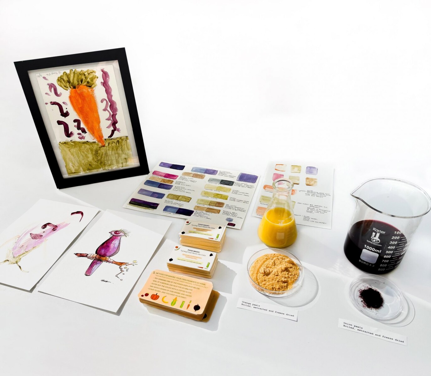 Zestaw zawiera trzy pojemniki do sortowania kompostu i kilka narzędzi opracowanych przez zespół, które zamieniają resztki w farby akwarelowe.