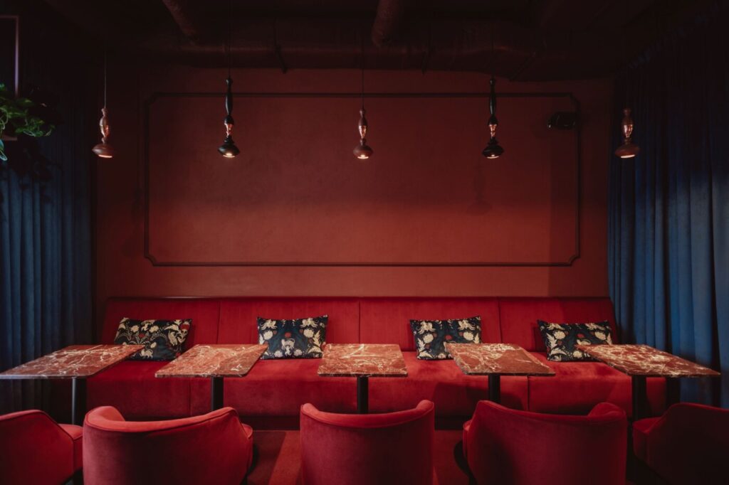 – „Duszą tej przestrzeni jest delikatnie rzeźbiony bar, wykończony stalą w odcieniu burgundu, który nadaje wnętrzu współczesny akcent i dyskretnie odbija światło. Miękkie tkaniny współistnieją tu z secesyjnymi sztukateriami i szlachetnymi materiałami, a całość dopełnia grafika Barta Sucharskiego” – komentuje Maja Skołysz z M19 Architekci.