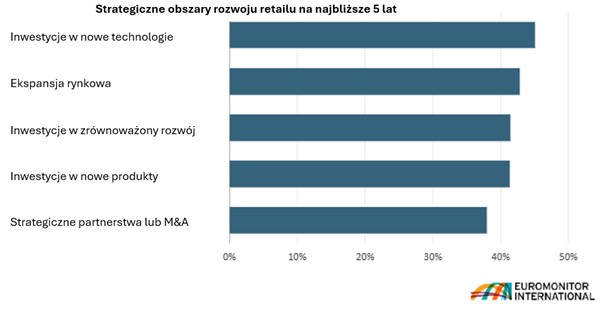 Rysunek 1 Opracowanie własne: odpowiedzi ekspertów sieci handlowych dotyczące strategicznych priorytetów rozwoju [Źródło: Badanie Voice of Industry: retail survey. Euromonitor 2023]