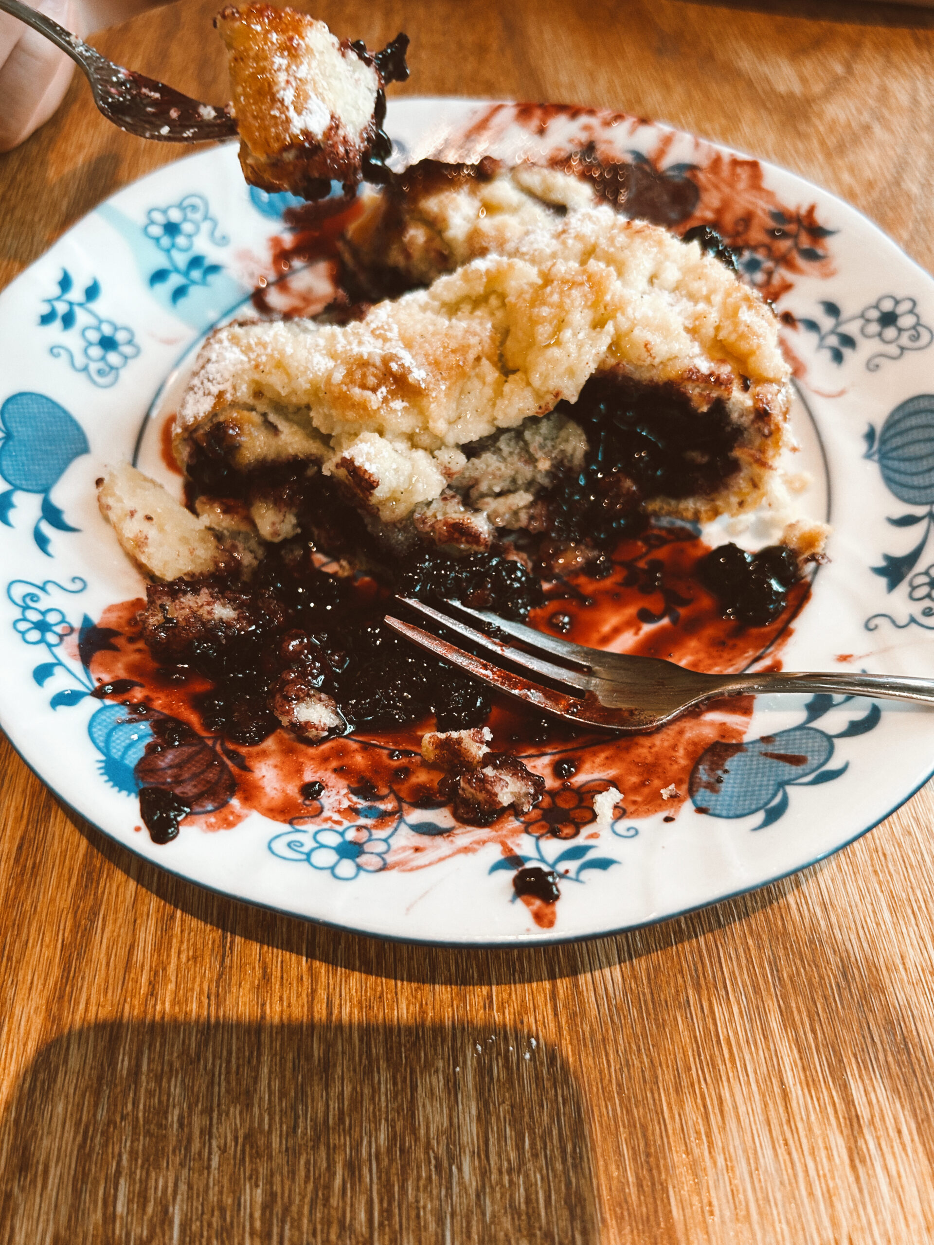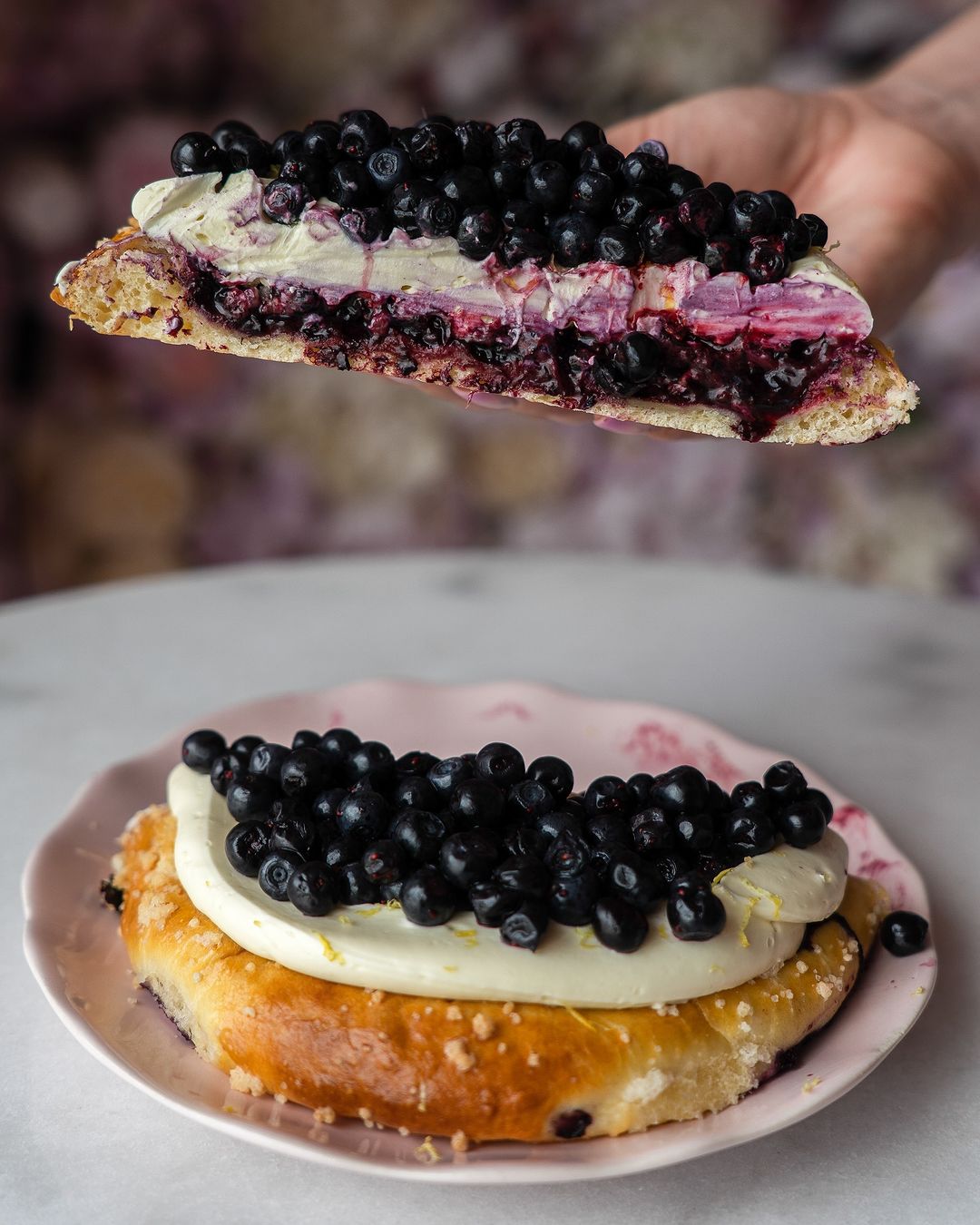 - Pistację Pod Jagodą, czyli ciasto drożdżowe zapieczone z jagodami z kremem z białej czekolady i pasty pistacjowej z Bronte.