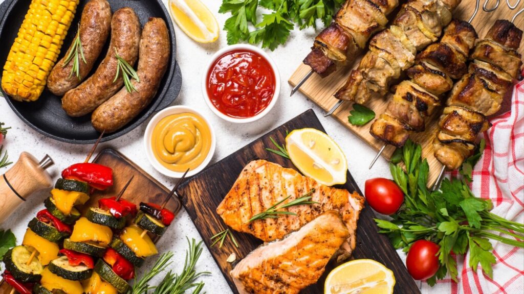 - Mięso i dodatki na grilla – karkówka, kiełbasy, sosy, marynaty, warzywa do szaszłyków